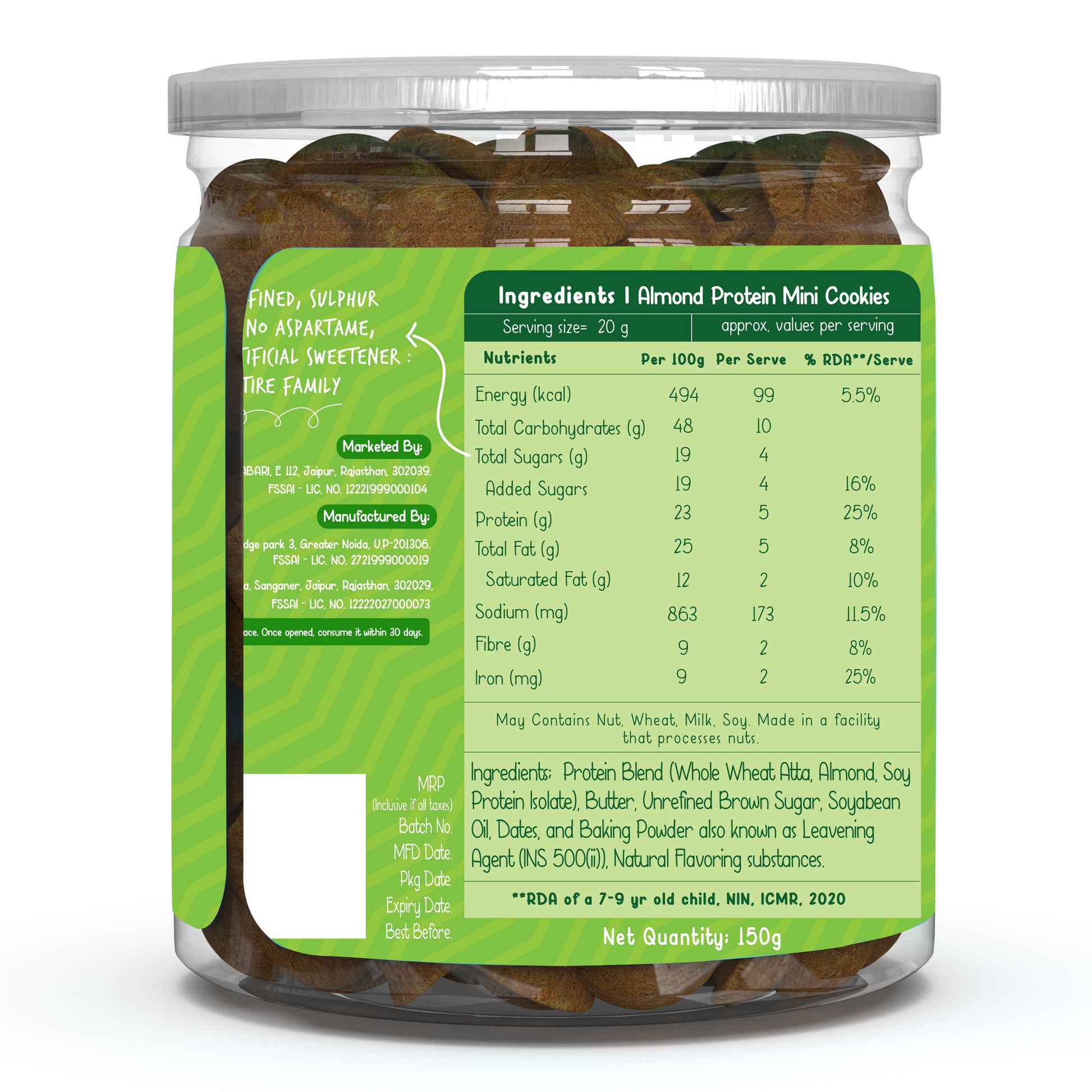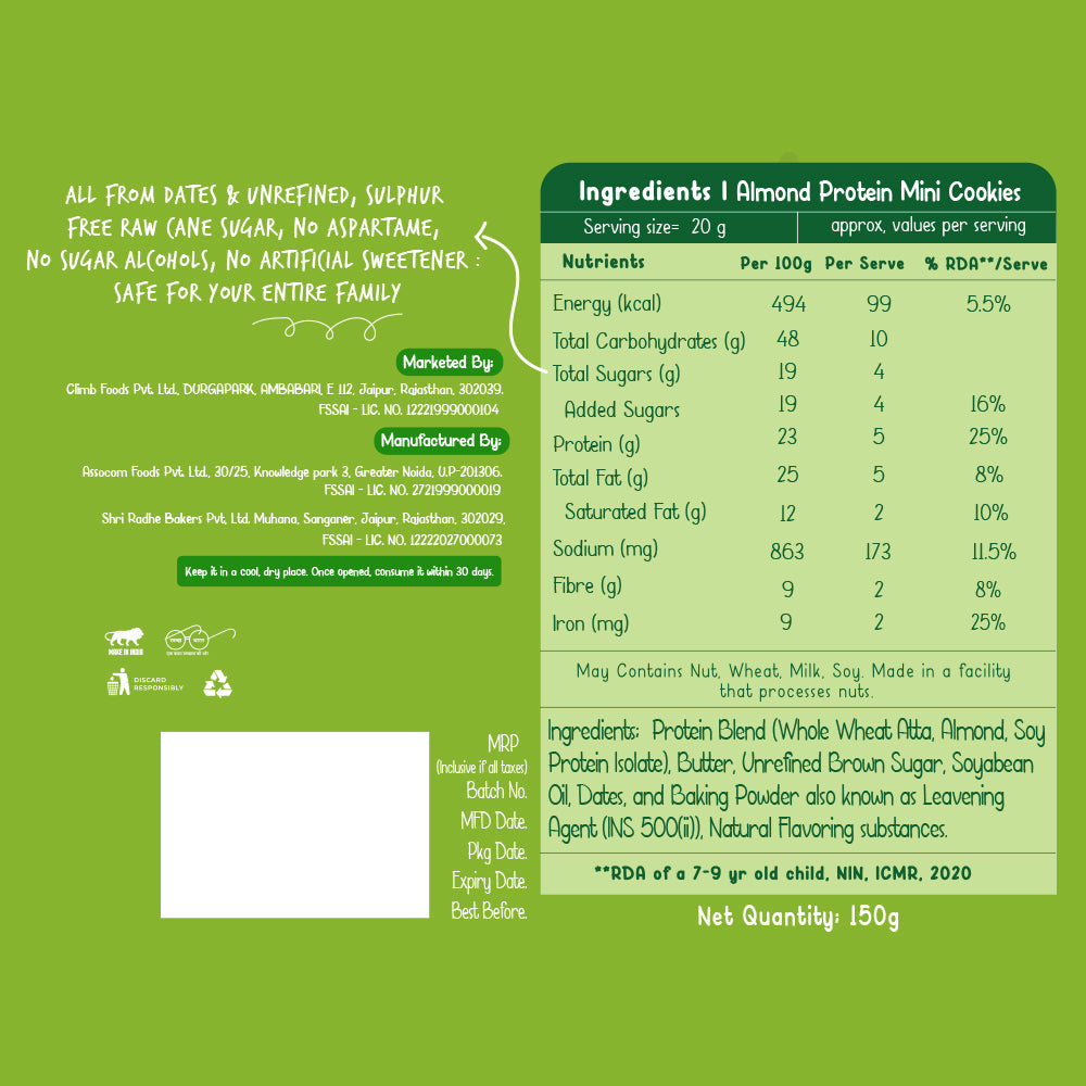 Enjoy the wholesome goodness of almonds in every bite of our Almond Mini Cookies. Made with a protein-rich blend of whole wheat atta and soy protein isolate, these cookies are naturally sweetened with unrefined brown sugar and free from maida and artificial sweeteners—perfect for a clean, nourishing snack.