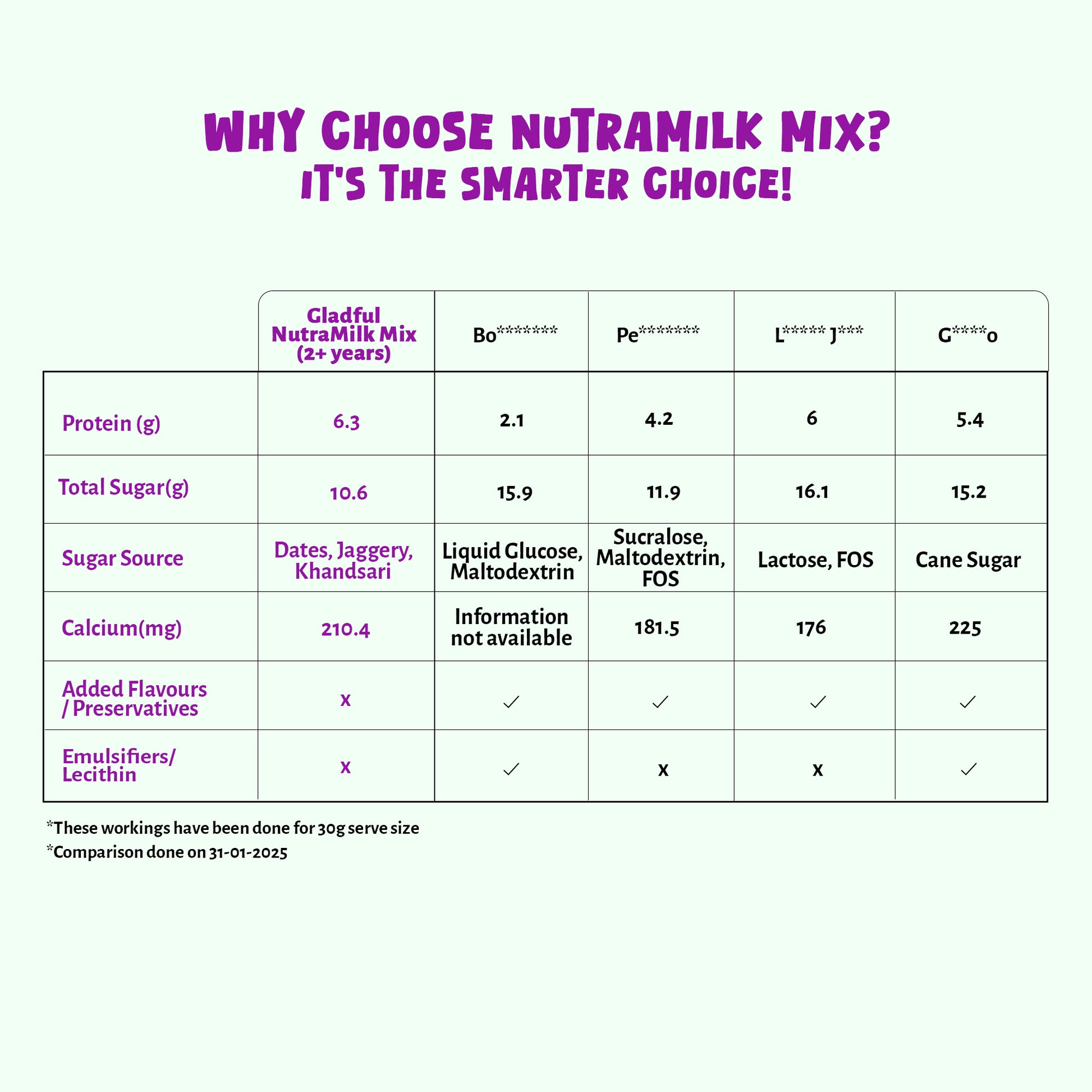 NutraMilk Mix is different because it’s free from preservatives, additives, and emulsifiers, which are commonly found in most milk mixes. Additionally, we focus on meeting your child’s protein needs, offering significantly higher protein content compared to most brands in the market.