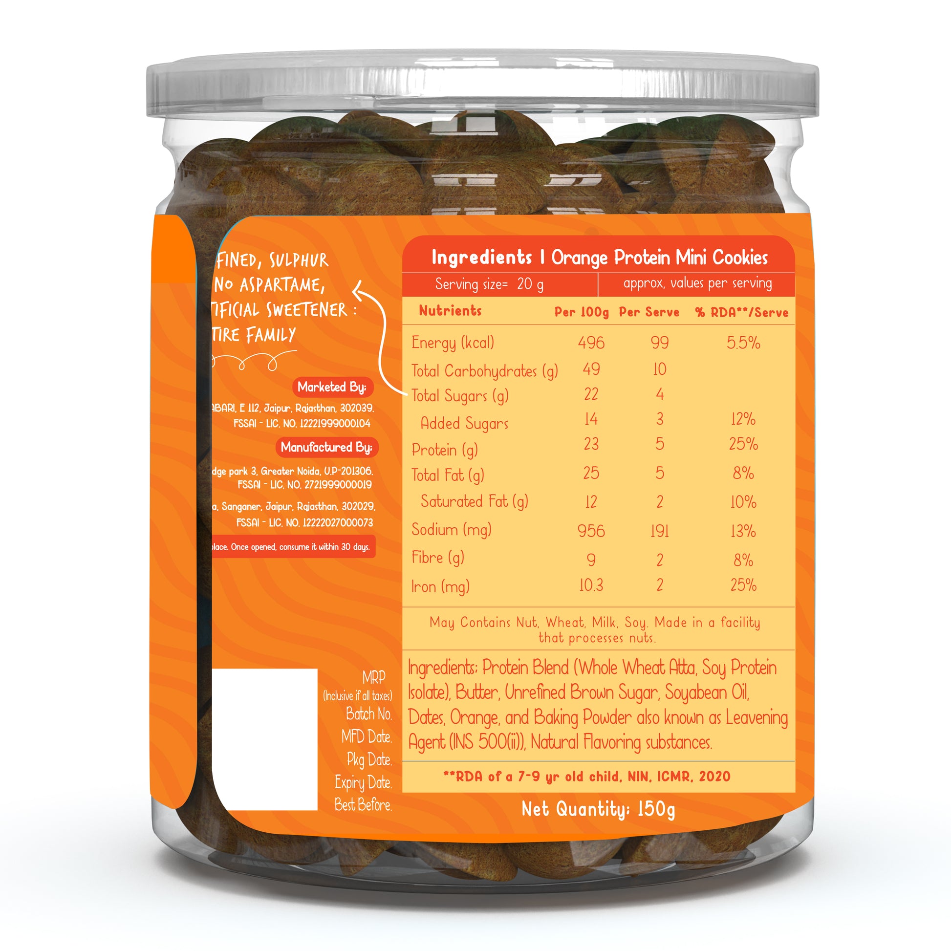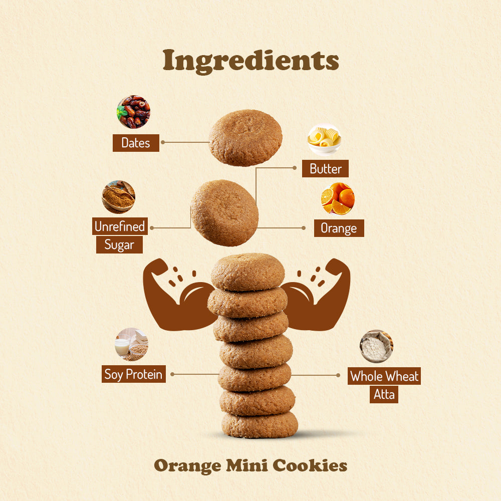 Brighten your snack time with our Orange Mini Cookies, made with wholesome whole wheat atta and a protein-rich blend for a guilt-free treat. Infused with real orange flavor and sweetened naturally with unrefined brown sugar, these mini cookies are perfect for a quick energy boost without any maida or artificial sweeteners.