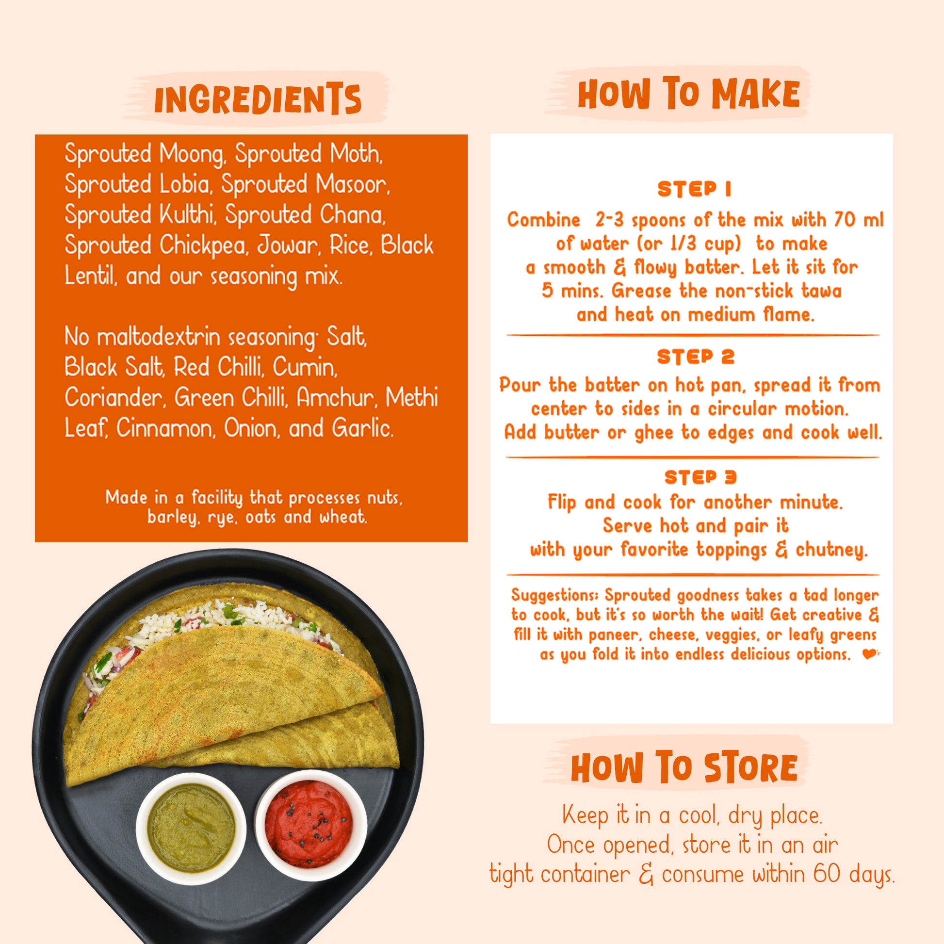 Hey there! Our sprouted breakfast range is a winner—100% gluten-free, no maida, no cholesterol, and zero trans-fat. Packed with protein and easily digestible, thanks to sprouted legumes & millets like moong, jowar, moth, amaranth, lobia, ragi, etc.